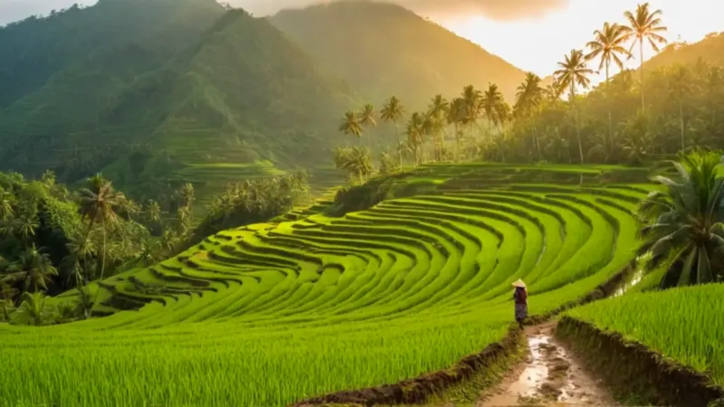 Los arrozales en terrazas que parecen escaleras hacia el cielo, los templos milenarios que vigilan desde acantilados y volcanes, y las playas de aguas turquesas crean un telón de fondo inolvidable.