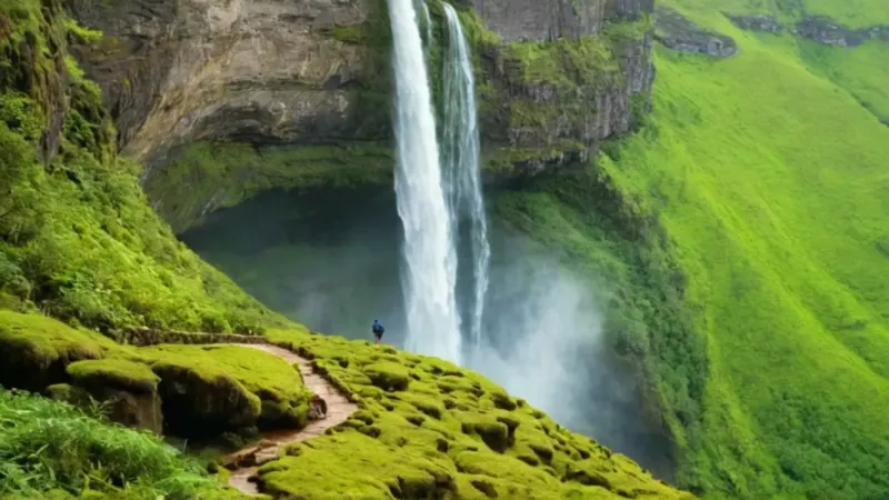 Tras atravesar este velo de agua, llegamos al anfiteatro final. La cascada principal de Madakaripura cae desde una altura de 200 metros en una cavidad circular, creando un estruendo ensordecedor y una atmósfera mágica. El lugar parece sacado de una película de Jurassic Park, un rincón secreto y primigenio de una belleza abrumadora.